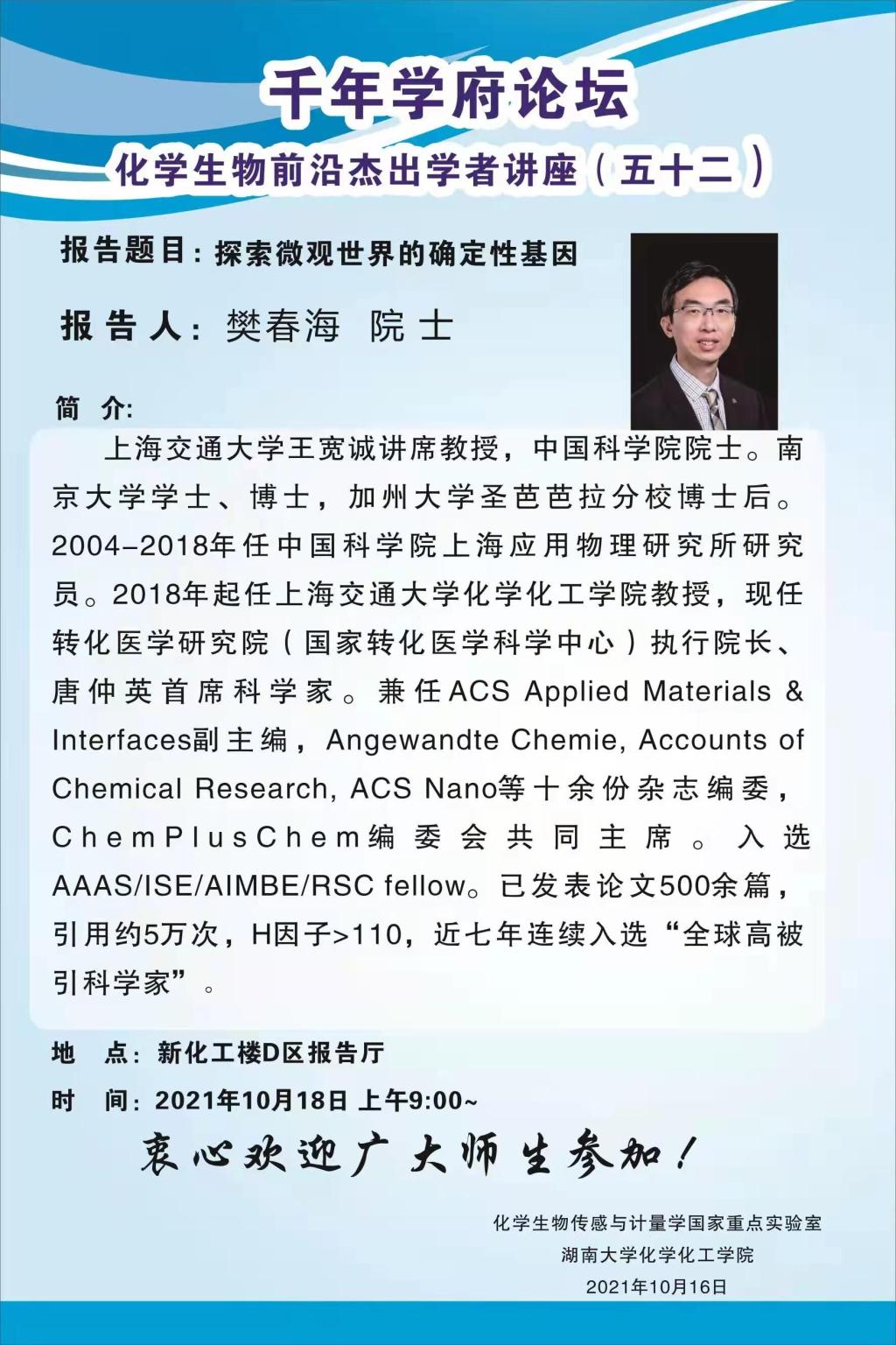 學(xué)術(shù)地點 新化工樓D區(qū)報告廳 主講人 樊春海 院士