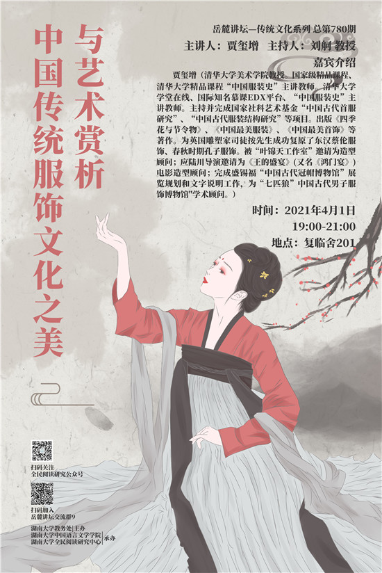嘉賓介紹:賈璽增(清華大學美術學院教授。國家級精品課程、清華大學精品課程“中國服裝史”主講教師。清華大學學堂在線、國際知名慕課EDX平臺、“中國服裝史”主講教師。主持并完成國家社科藝術基金“中國古代首服研究”、“中國古代服裝結構研究”等項目。出版《四季花與節令物》、《中國最美服裝》、《中國最美首飾》等著作。為英國雕塑家司徒按先生成功復原了東漢蔡倫服飾、春秋時期孔子服飾。被“葉錦天工作室”邀請為造型顧問;應陸川導演邀請為《王的盛宴》(又名《鴻門宴》)電影造型顧問;完成盛錫福“中國古代冠帽博物館”展覽規劃和文字說明工作,為“七匹狼”中國古代男子服飾博物館"學術顧問。)