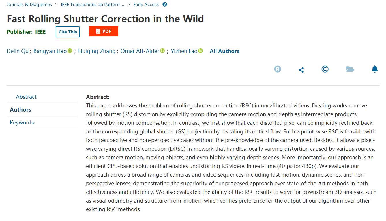 2023/06/21勞奕臻副教授指導(dǎo)兩名本科生在卷簾快門相機(jī)的三維視覺應(yīng)用研究取得進(jìn)展近日,信息科學(xué)與工程學(xué)院勞奕臻副教授指導(dǎo)兩名本科生在卷簾快門相機(jī)(Rolling shutter)的三維視覺應(yīng)用領(lǐng)域取得進(jìn)展,針對(duì)卷簾快門相機(jī)因時(shí)空離散的曝光模式易導(dǎo)致圖像出現(xiàn)幾何形變的問題,提出了一種高效的圖像... -